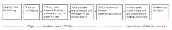 Die Prozessdauer versuchen wir möglichst kurz zu halten, damit sie schnellstmöglich Gewissheit über den Status Ihrer Bewerbung haben.